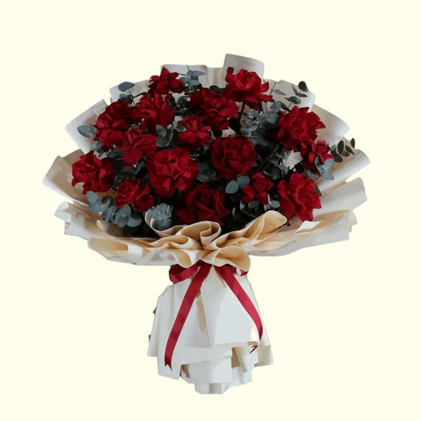 This elegant bouquet features 30 fresh Bloom red roses paired with 20 stems of fragrant eucalyptus, expertly arranged and wrapped in a handcrafted beige-colored paper. The combination offers a striking contrast of vibrant red and soft greenery, perfect for making a sophisticated and lasting impression. Ideal for special occasions or as a refined gift, this arrangement balances classic beauty with modern design.