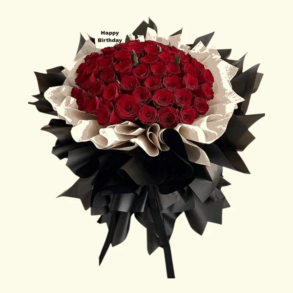 Celebrate your special moments with “Love You More,” a stunning bouquet of 50 fresh red bloom roses. Expertly hand-crafted and wrapped in elegant white and black paper, this arrangement combines classic beauty with sophisticated presentation. Perfect for expressing deep affection, these vibrant roses ensure your message of love is delivered with timeless elegance.